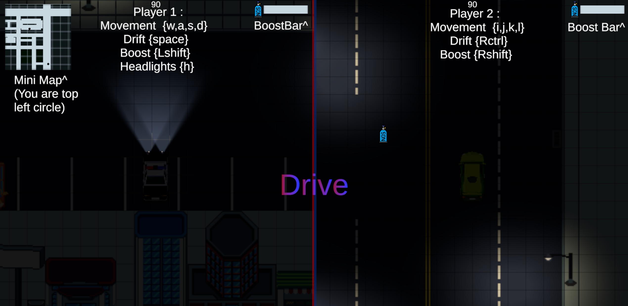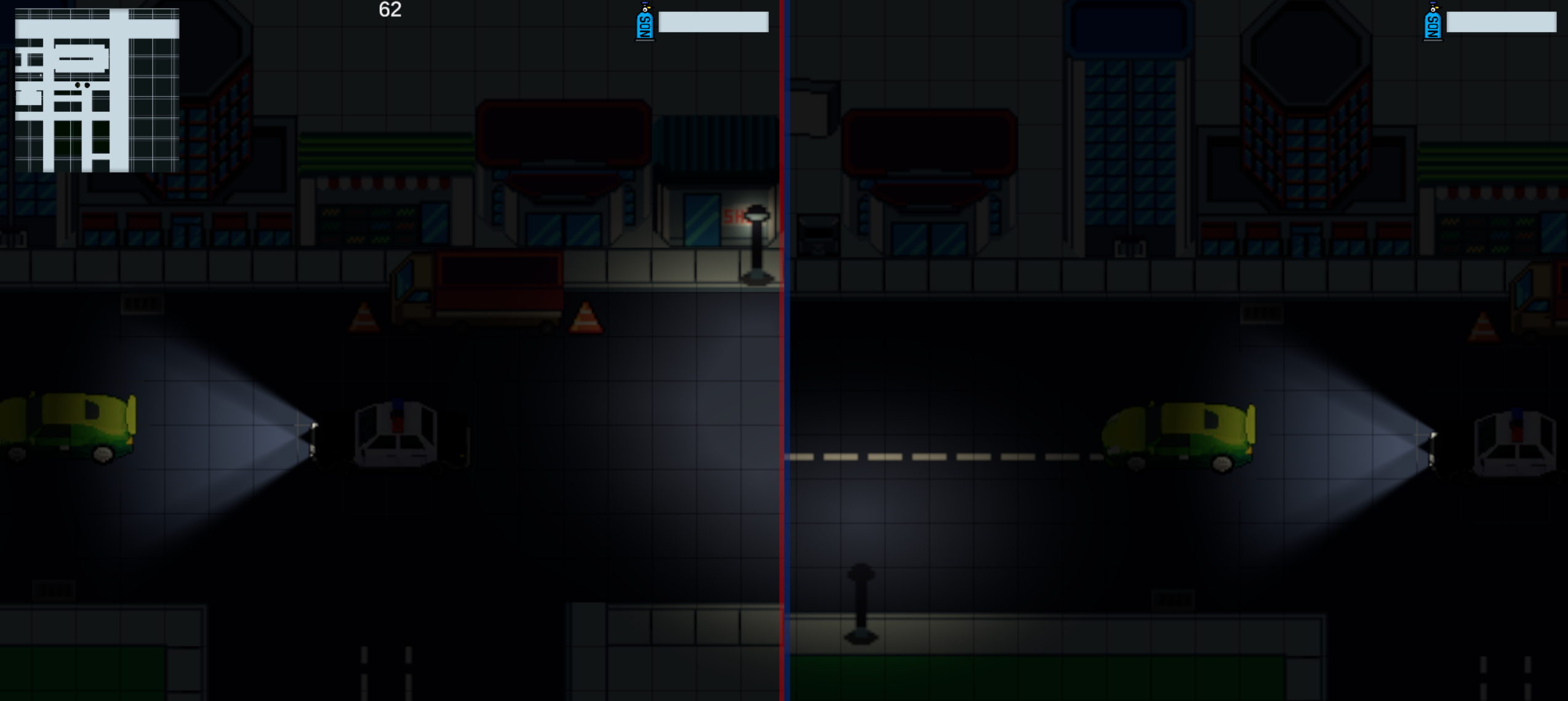 A fast, split‑screen, top‑down car chase. One player is the Cop hunting, the other the Robber surviving the night. Drift through a city, weave past static traffic, and use boost at the perfect moment.